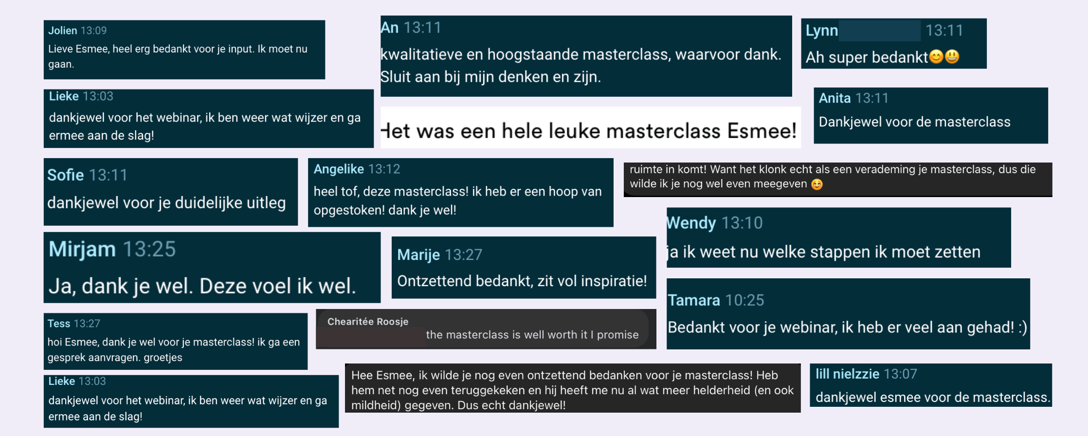 Mijn aanpak is persoonlijk, uniek en superpraktisch, zodat je gelijk weet welke stappen je in welke volgorde kunt zetten.